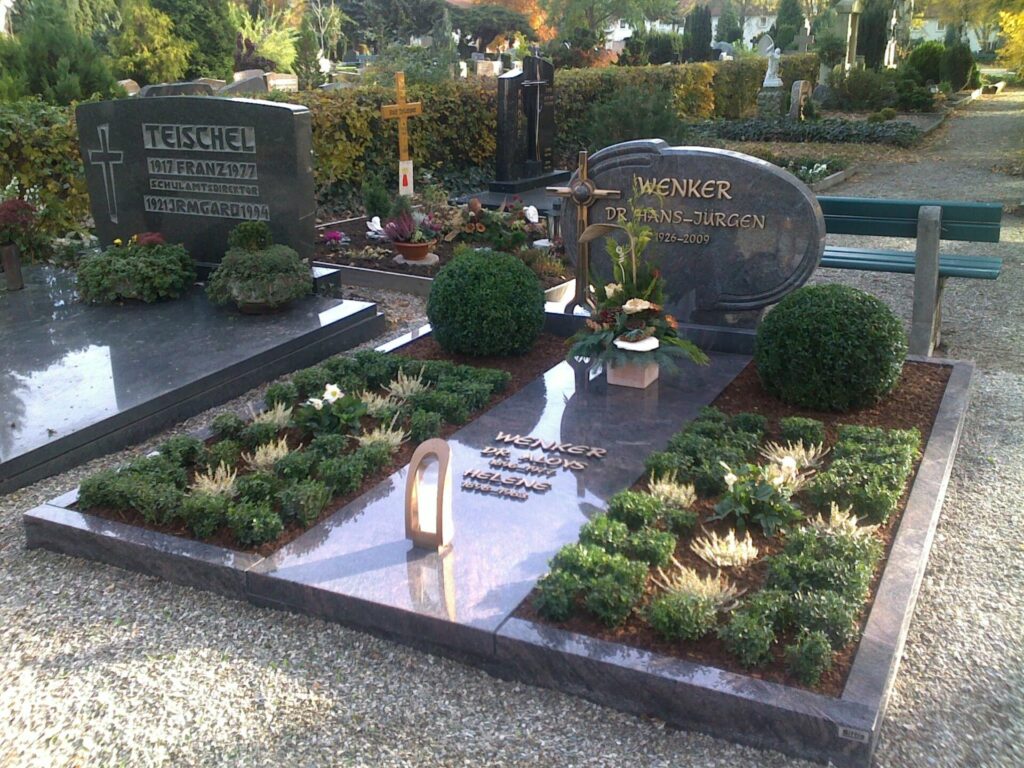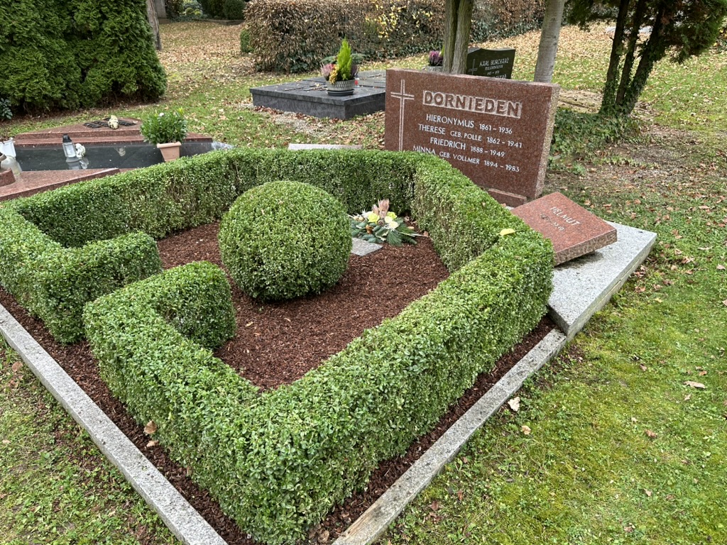 Da wir regelmäßige Gießgänge nicht anbieten können, bepflanzen wir Ihre Grabanlage i. d. R. mit dauerhaften Gehölzen und Stauden, die mit einem minimalen Pflege- und Gießaufwand zurecht kommen, sodass Ihre Grabanlage ohne großen Aufwand über das ganze Jahr attraktiv und gepflegt aussieht. Unsere Grabpflege, die sich auf Form- und Rückschnitt, Düngung und Laubentfernung beschränkt, kommt mit 2-3 kurzen Pflegegängen pro Jahr aus. Auf Wunsch übernehmen wir auch gern die Lieferung von Grabgestecken und bepflanzten Schalen zu bestimmten Anlässen. Sprechen Sie mit uns!