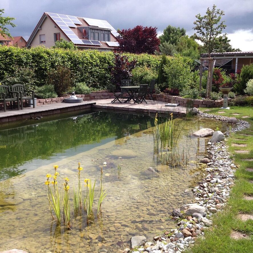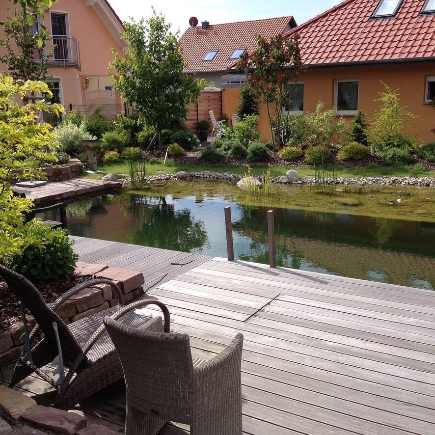 Kundenwusch: Ein Schwimmteich für die Familie mit einer Schwimmzone 9×5 m, einem Bachlauf, einem Holzsteg und einem Sitzplatz am Wasser.