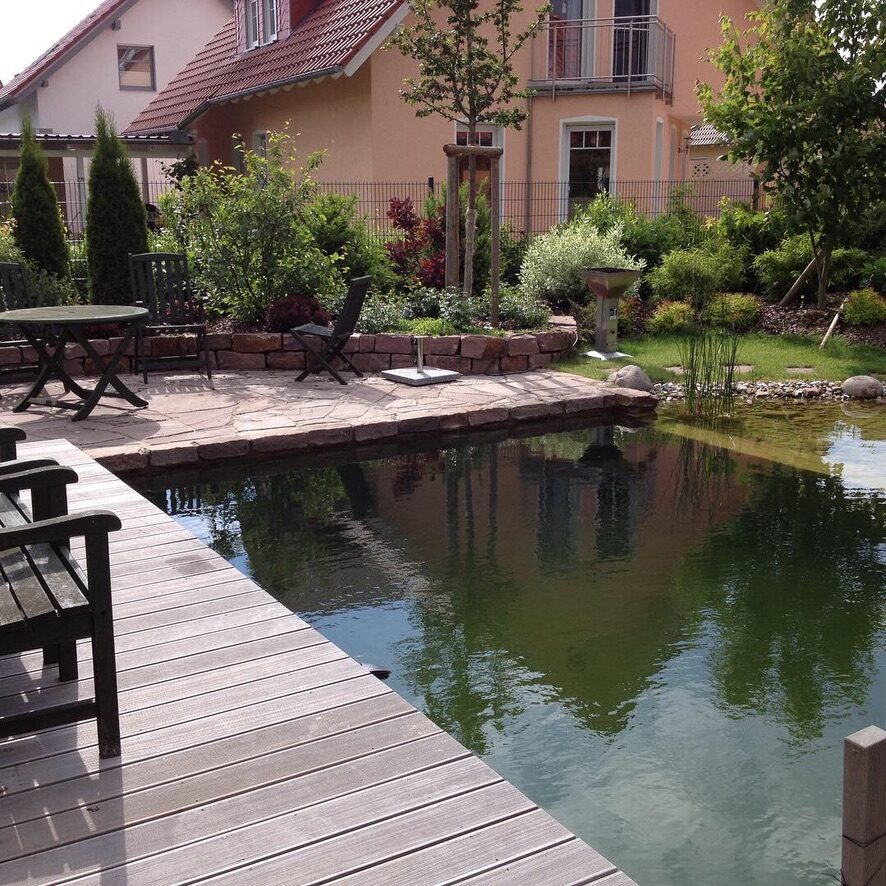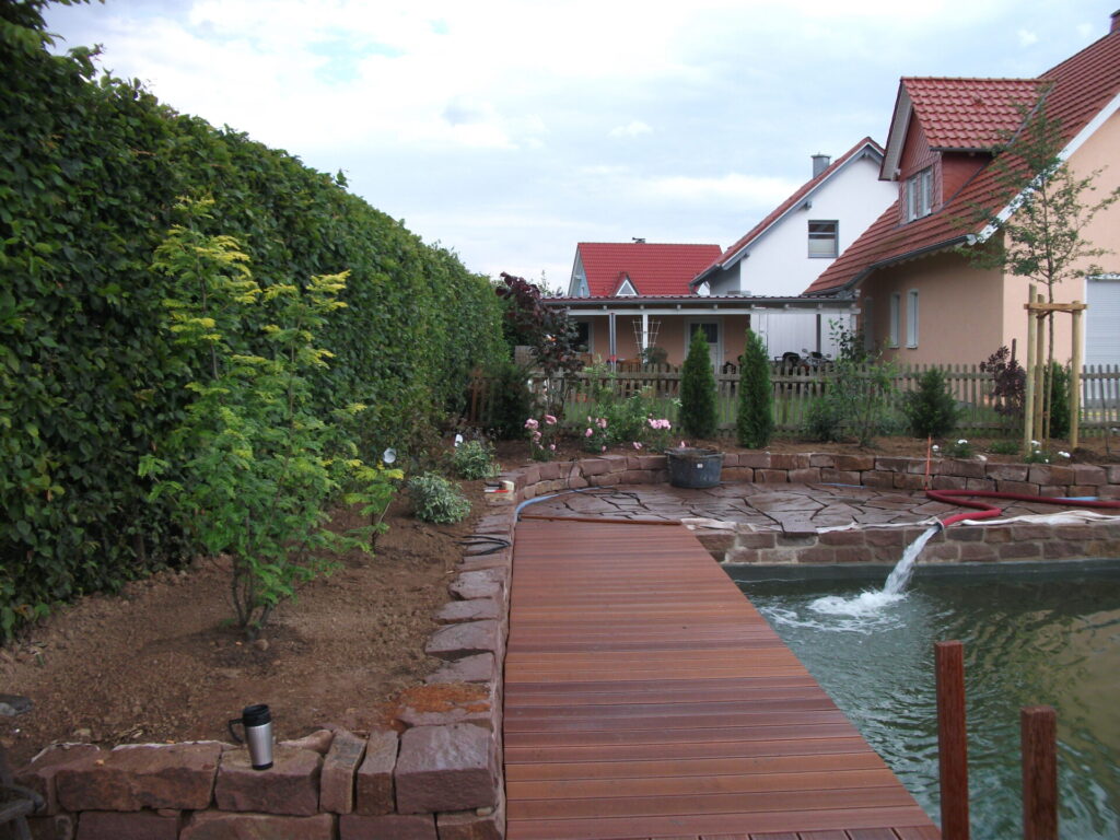 Realisation: Entstanden ist ein Schwimmteich mit einem gemauerten Bachlauf aus Sandstein, über den das gefilterte Wasser wieder in den Teich läuft. Die Filteranlage befindet sich in einem kleinen Gartenhäuschen neben dem Bachlauf. Der Holzsteg entlag der Längsseite des Teichs führt zu einem Sitzplatz, der von einer Sandstein Trockenmauer eingefasst und mit Sandstein-Polygonalplatten belegt ist. Mauern, Sitzplatz, Treppenstufen und Bachlauf wurden aus rotem Weserhartsandstein hergestellt.