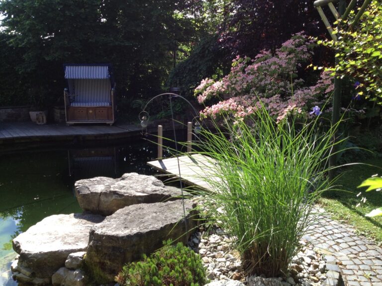 Realisation: Entstanden ist ein kleiner Schwimmteich, der im hinteren Bereich durch eine Mauer aus Hartsandstein abschließt, hinter der sich die Filteranlage befindet. In die Mauer integriert ist ein kleiner Wasserfall. Die Holzterrasse an der Längsseite nimmt die Nierenform des Teiches auf. Ihr gegenüber befindet sich ein Holzsteg mit Eintrittsleiter. Im vorderen Bereich laden große, flache Kalksteinfelsen zum Sitzen und Sonnen ein.