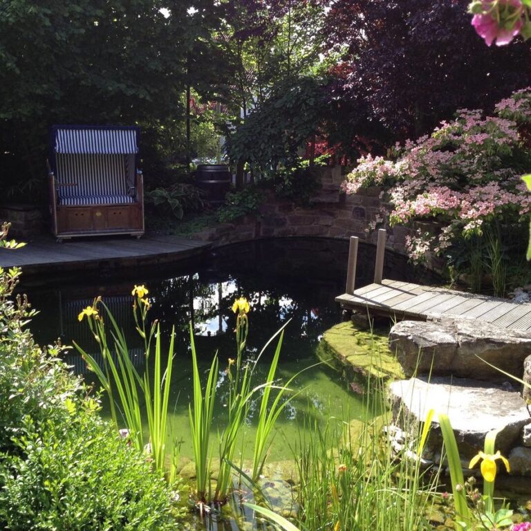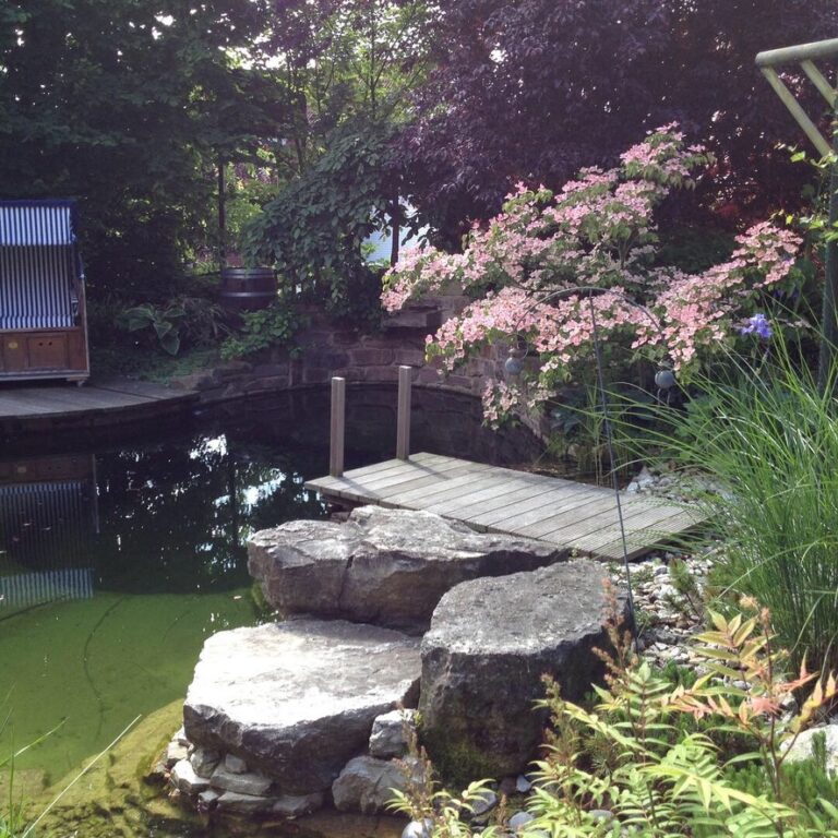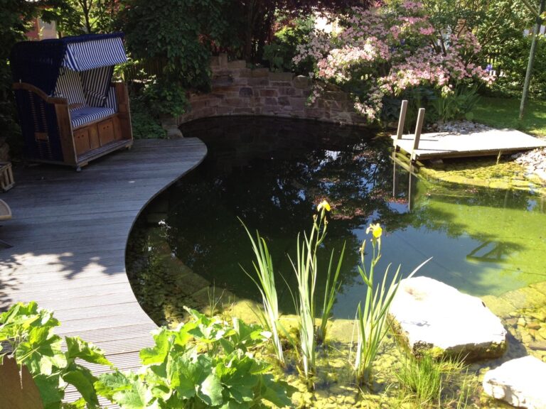 Kundenwunsch: Rückbau eines verlandeten Gartenteichs und Gestaltung einer kleinen Schwimmteichanlage mit Zugangssteg und Stegterrasse.