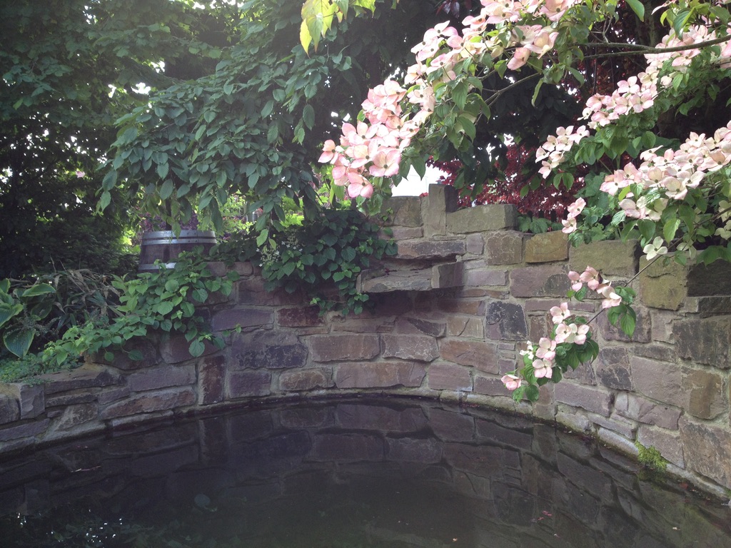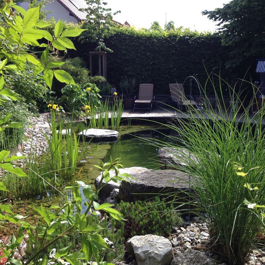 Realisation: Entstanden ist ein kleiner Schwimmteich, der im hinteren Bereich durch eine Mauer aus Hartsandstein abschließt, hinter der sich die Filteranlage befindet. In die Mauer integriert ist ein kleiner Wasserfall. Die Holzterrasse an der Längsseite nimmt die Nierenform des Teiches auf. Ihr gegenüber befindet sich ein Holzsteg mit Eintrittsleiter. Im vorderen Bereich laden große, flache Kalksteinfelsen zum Sitzen und Sonnen ein.